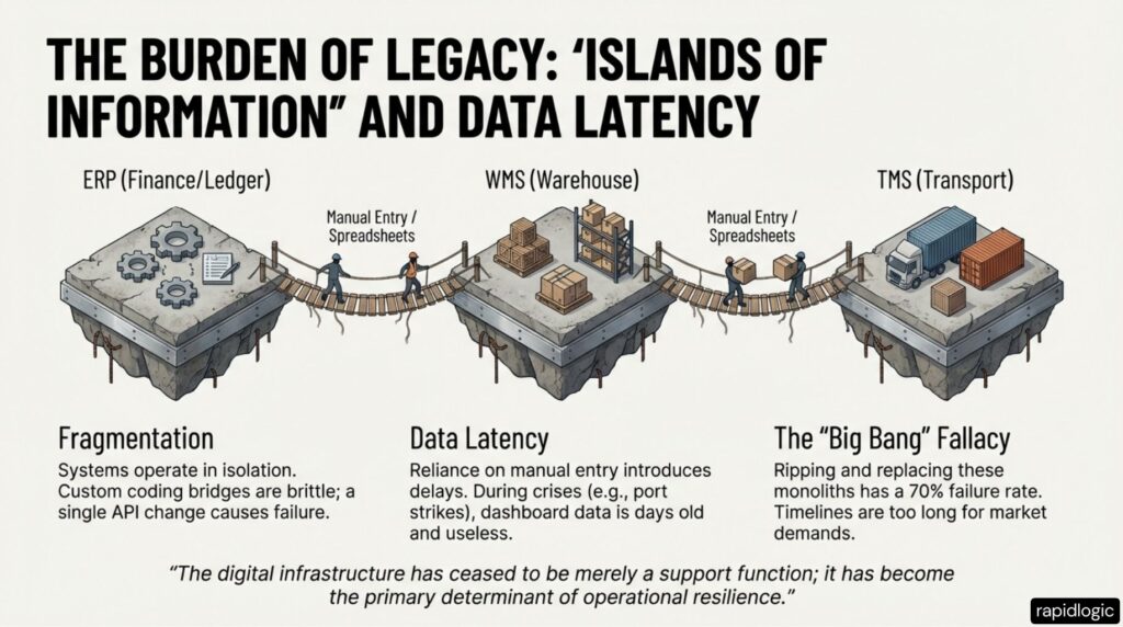 Traditional TSL architectures are defined by fragmentation. A Warehouse Management System (WMS) operates in isolation from the Transportation Management System (TMS), which is itself disconnected from the ERP. In a crisis scenario – a port strike, a geopolitical rerouting such as the Red Sea disruption – the lag between an event occurring and appearing in a decision-making system can stretch to days, rendering the data operationally useless.