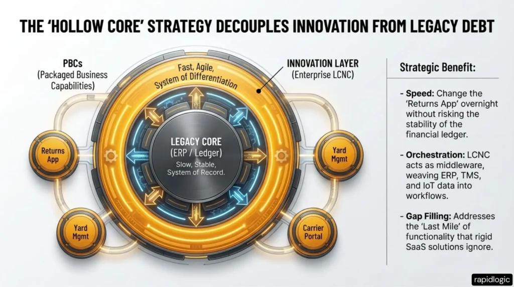 - Adopt a ‘Hollow Core’ Architecture: do not attempt to rip and replace legacy WMS/TMS immediately. Instead, use LCNC to wrap and extend these systems, building the innovation layer around the stable transactional core.